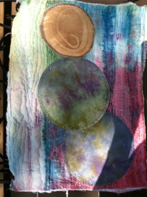 This is an art quilt for" FastFridayFabricChallenge" I used recycled fabric including an upholstery scrap and I chose to do an abstract. Free motion embroidery.